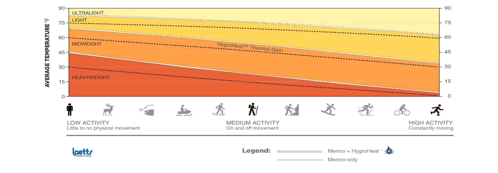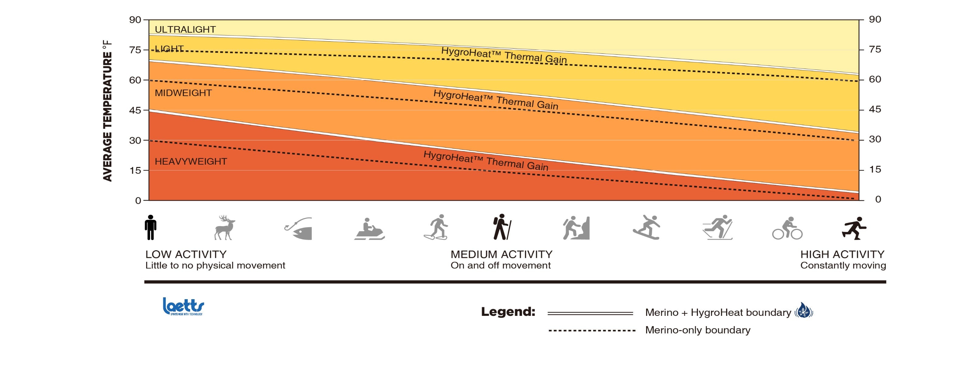 Illustration shows how Laetts’ thermal performance system maintains warmth across changing activity levels, compared to static insulation approaches.