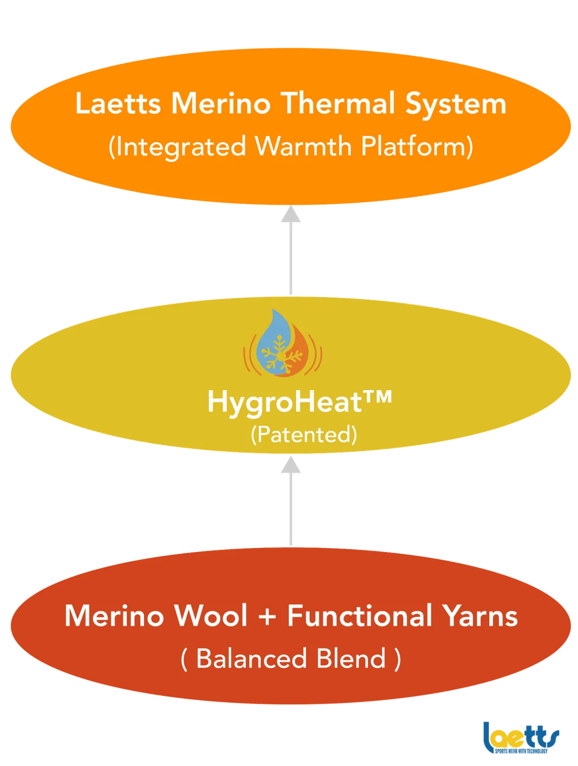 From alpine summits to frozen trails, the Laetts Merino Thermal System™ redefines what Merino can do. By weaving patented HygroHeat™ into premium Merino, it transforms natural wool into a high-performance thermal engine — delivering: