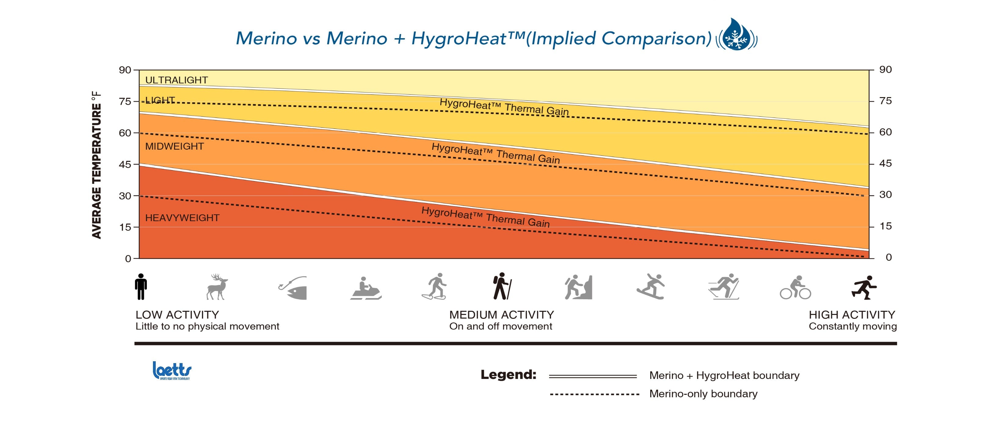 - Solid boundary lines represent performance within the Merino Thermal System, where Merino wool is enhanced with patented HygroHeat™ technology.