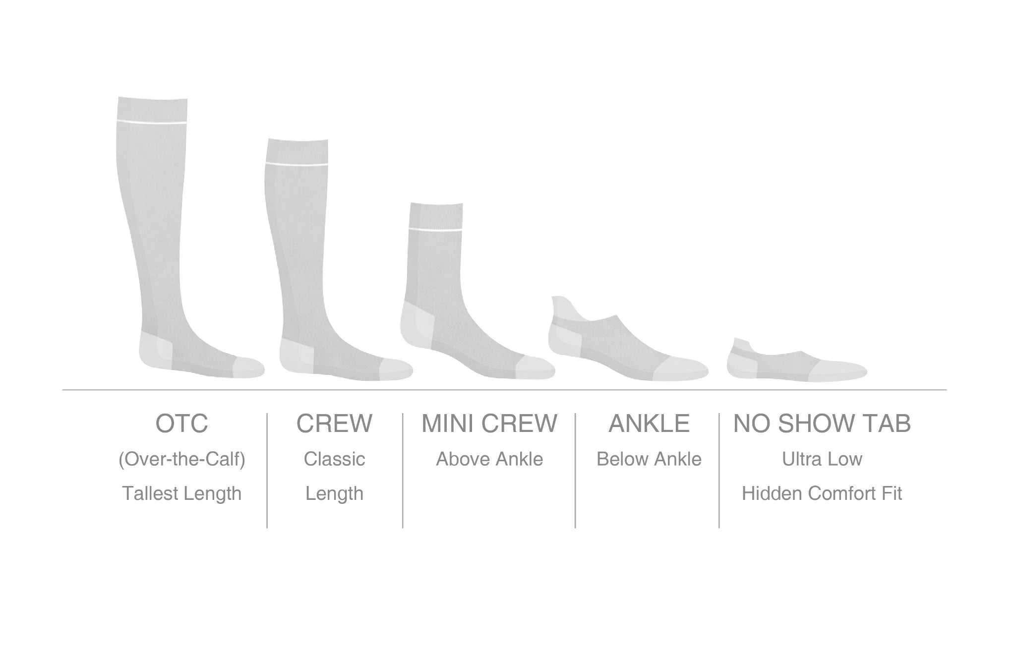 From over-the-calf designs engineered for full boot protection, to ultra-low profiles built for minimal interference, each Laetts sock height is selected to support a specific performance use case. The diagram above outlines the primary height options—OTC, Crew, Mini Crew, Ankle, and No Show Tab—each designed to balance coverage, mobility, and comfort across different sports and conditions.