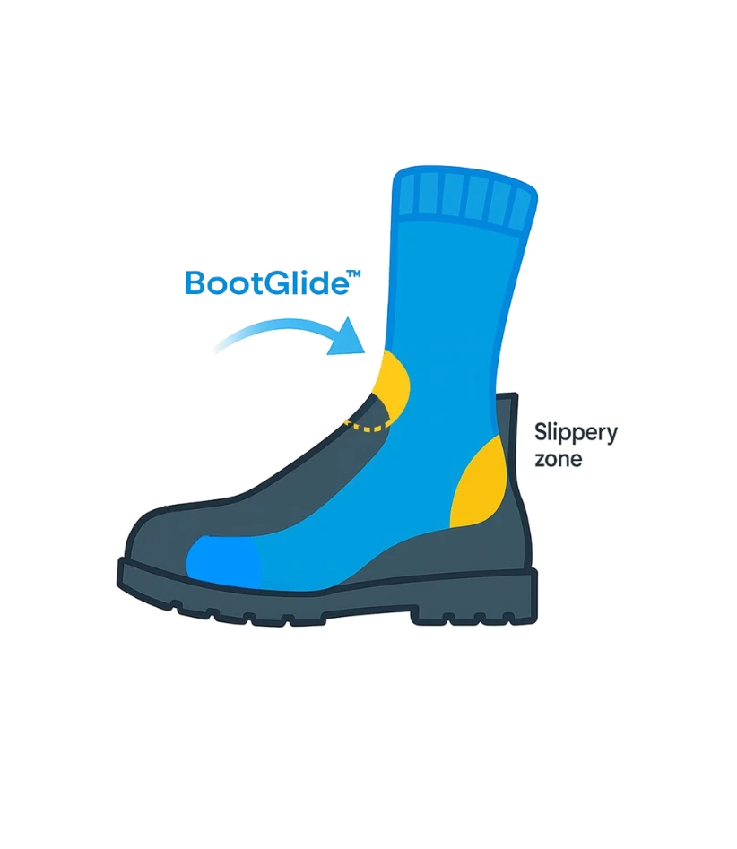 Integrated directly into targeted zones of the sock structure, BootGlide™ reduces friction during boot-on and boot-off, while supporting smoother motion throughout wear—without compromising fit, warmth, or stability.