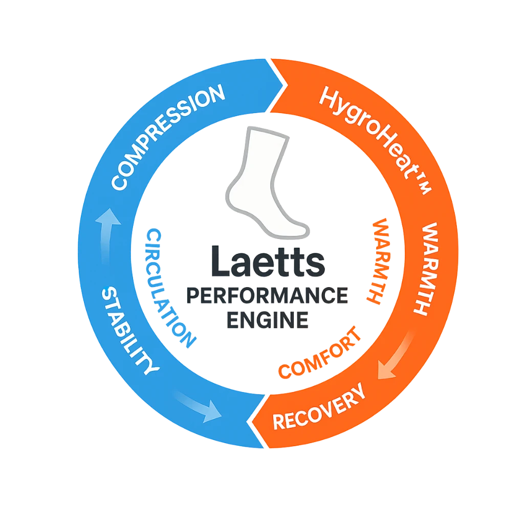 HygroHeat™ is Laetts’ patented internal thermal technology, engineered directly into the sock structure to regulate body-generated warmth from within. Rather than relying on bulk or trapped air alone, HygroHeat responds to the wearer’s natural heat and moisture, helping stabilize warmth as activity levels and conditions change.