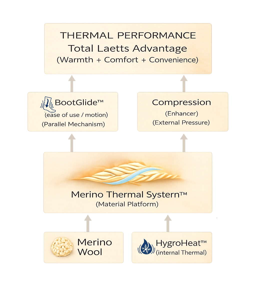 This patent protection reinforces Laetts’ system-first approach — ensuring that HygroHeat™, the Merino Thermal System™, BootGlide™, and compression function as engineered components within a single performance framework, not isolated features.